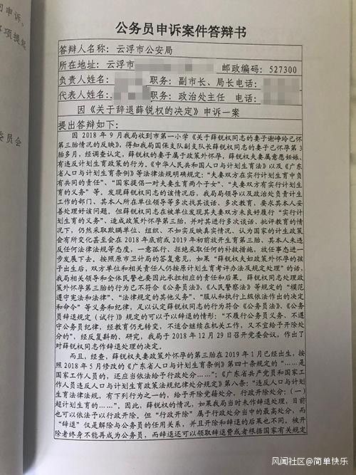 澎湃新聞注意到,在一份《公務員申訴案件答辯書》中,雲浮市公安局答覆説,按照原市衞計局的答覆意見,如果“薛鋭權夫婦政策外懷孕的孩子出生後,雙方單位和相關責任人仍按原計劃生育考評辦法及規定處理”的話,市公安局相關領導和全體民警也要因此承擔相應的責任和後果。薛鋭權處理政策外懷孕第三胎的行為已不符合《公務員法》、《人民警察法》等規定的“模範遵守憲法和法律”“法律規定的其他義務”“服從和執行上級依法作出的決定和命令”等義務和紀律,足以認定其行為符合《公務員法》、《公務員辭退規定(試行)》規定的可以辭退的情形,“不履行公務員義務、不遵守公務員紀律,經教育仍無轉變,不適合繼續在機關工作,又不宜給予開除處分的”。