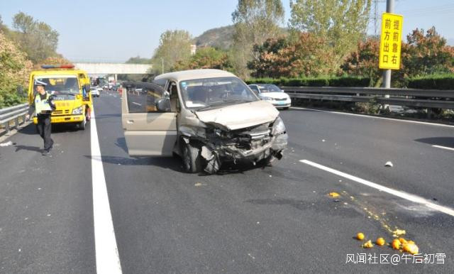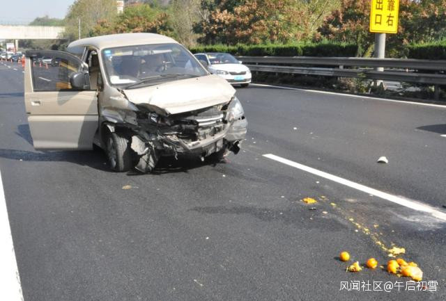 抬眼望去,事故車停在第二車道,車頭車尾都撞爛了,車後窗和第三排後窗都破了,蔬菜、水果和衣物灑落在路上。