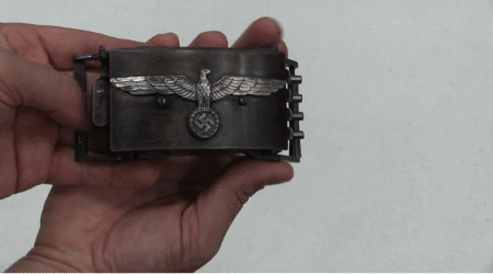 腰帶槍由路易斯·馬奎斯發明,該槍有一個帶有鉸接的納粹標誌蓋板,在使用時要同時按住左側的兩個按鈕,蓋板就會向上彈起並露出四個長2英寸的獨立槍管。在槍管的側面分別有一個扳機,每按下一個扳機,相應的槍管都會射出一枚.22的子彈。但是由於生產腰帶槍的工廠在二戰期間的一次空襲中被摧毀,因此存量極少。