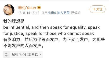 在班雅倫的微博頁面上,一條寫於2018年夏天的微博被放在了置頂的位置。這條微博是這麼寫的:我的理想是有影響力,為平等而發聲,為正義而發聲,為那些不能發聲的人而發聲。從開始做視頻博主,到有一定的粉絲,再到如今因為仗義執言走紅網絡,班雅倫想告訴青年朋友,面對偏見和不公,就要勇敢地説出來。
