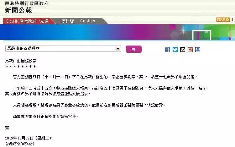 香港特區政府12日零時44分發布新聞公報,稱警方正調查這宗企圖謀殺案。