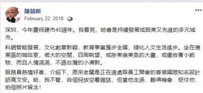 另一方面,耿直哥還發現在陳競新2018年的一些貼文中發現,與香港街頭那些暴徒不同的是,他對內地並沒有狹隘的排斥或牴觸,反而還在積極地看待內地的變化和發展,尤其是很認可深圳這座“既美又先進”的多元城市。他還十分認同中華文化,並以此為榮。