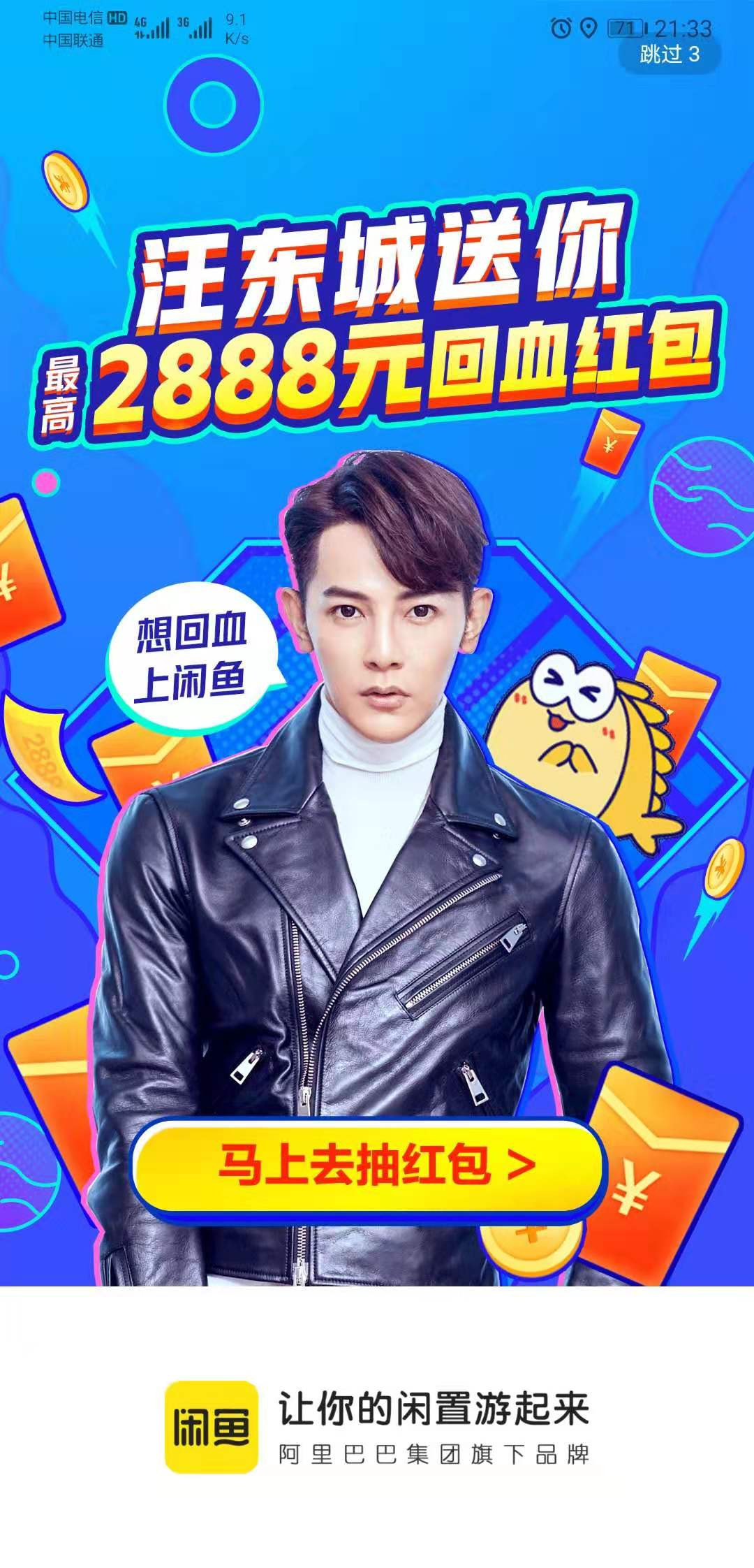 不僅如此,鋅財經瞭解到,14日凌晨,閒魚的開屏廣告頁面已經換成了,“汪東城送你最高2888元回血紅包,”直指為雙十一的消費回血,賺足眼球。