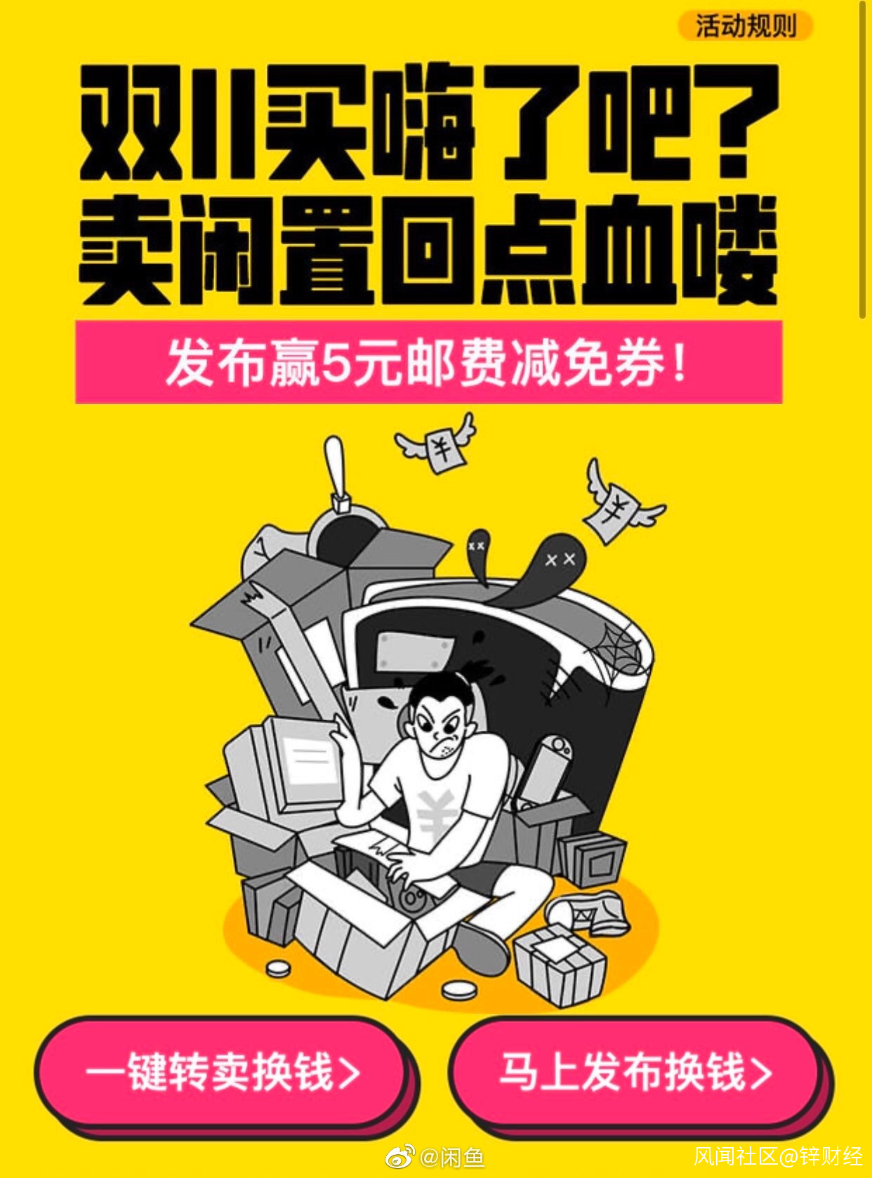 “雙11買嗨了吧?賣閒置回點血嘍。”雙11剛過,阿里巴巴旗下閒置交易平台APP客户端閒魚,便在首頁頭圖更新了以“雙11回血季”為核心訴求的鏈接。類似的活動促銷,同樣出現在了這款APP的開屏廣告頁,頗為醒目。