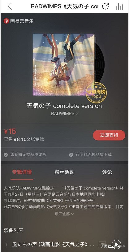 美得能做壁紙的畫面和委婉動聽的配樂,一直以來都是新海誠電影作品的大賣點。而通過《天氣之子》EP在國內音樂平台上的銷售,也再次得到證實——ACGx也發現,電影上映時同期在網易雲音樂上銷售的EP《天氣之子 complete version》,已經賣出近10萬張。