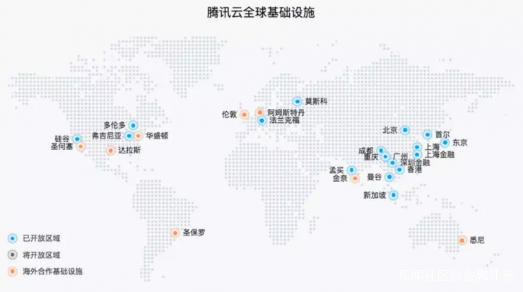 2014年7月,開放了香港數據中心節點,預示了騰訊雲正式“參戰”全球雲服務市場。官方資料顯示,隨着公司在亞洲、歐洲、北美洲、南美洲、大洋洲等地數據中心的擴建,目前騰訊雲已在全球開放25個地理區域,運營53個可用區。在可用區之外,騰訊雲在全球 50 多個國家和地區,部署了超過1300個CDN加速節點。
