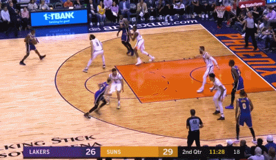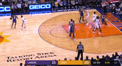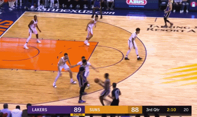 隆多在打擋拆的時候有一個特點,無論對手換防後自己的位置多深,或者對手如何將自己放掉,他都不會把自己進攻當成第一選擇。所以,即使他做一對一的佯攻,擋拆隊友都不能袖手旁觀,即使時間快到24秒,他仍然會尋找傳球機會。