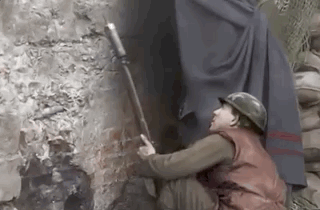 一羣士兵坐在一根長木棍上方便,忽然木棍斷了,他們齊齊落入糞坑中……戰友一邊鬨笑,一邊把這些倒黴蛋拉上岸: