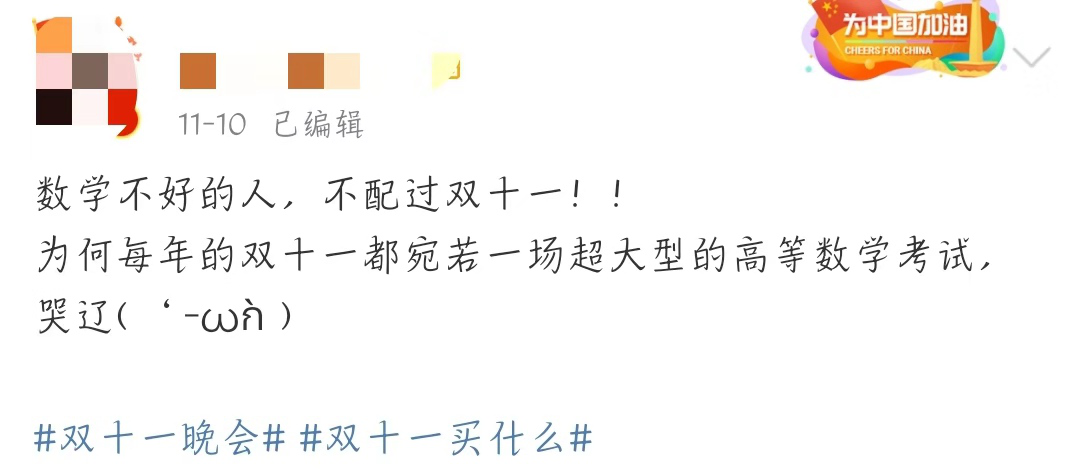 此前,一則“數學不好”的梗成為了微博熱門,很多人以此梗發表了自己對於雙十一看法: