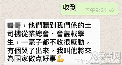 不少香港的士司機主動提供幫助,圖為一位司機向一組織者的反饋(截圖已獲該組織者授權發佈)