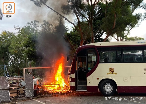 11月12日晚上,香港激進示威者在中大校園內多處雜物起火。(圖源:香港中通社)