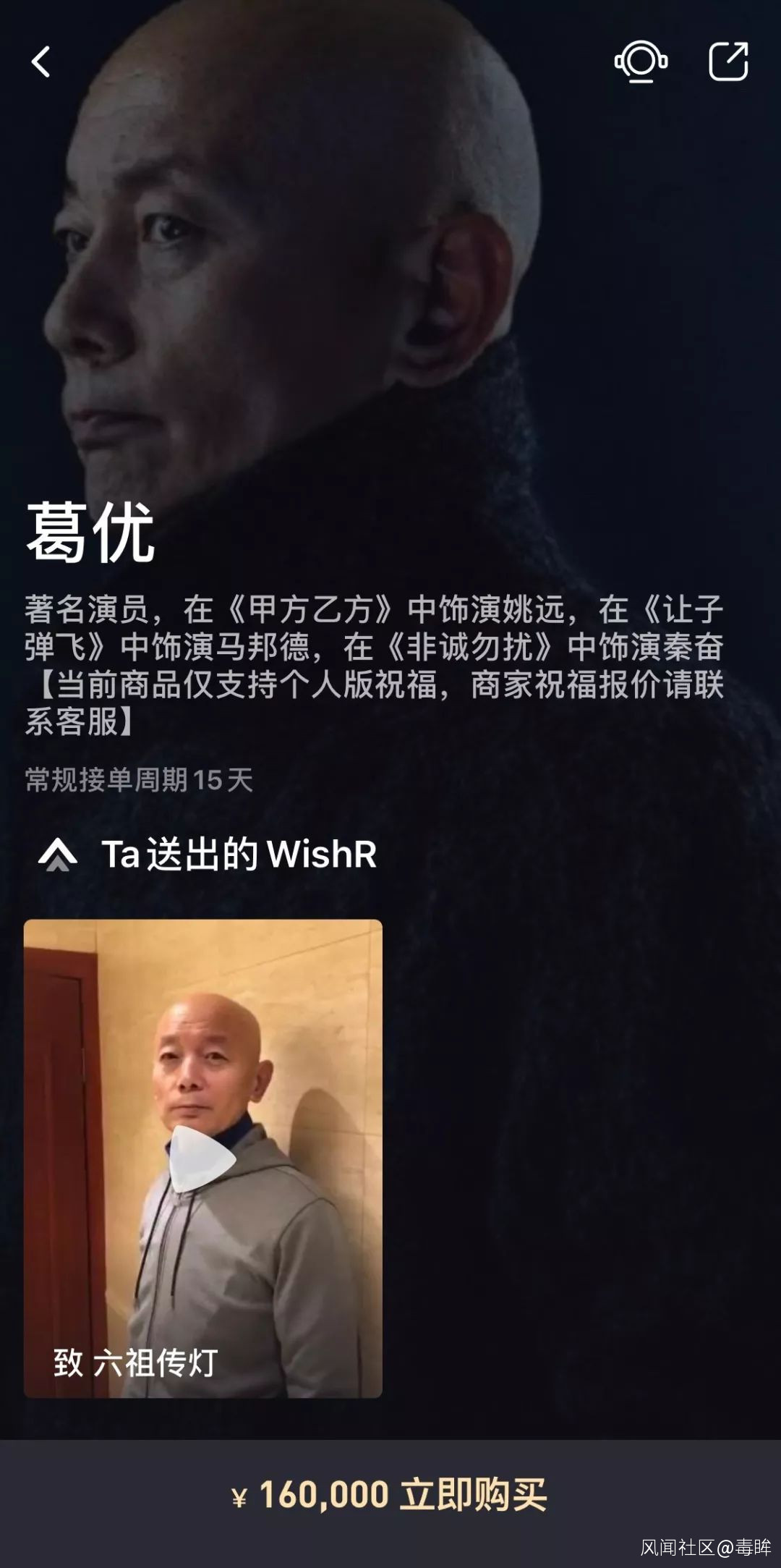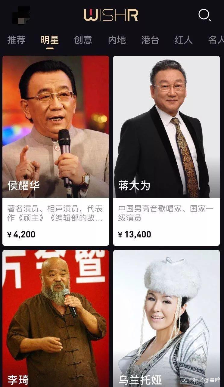 然而一波未平,一波又起。日前,關於可以在一款名為“wishR”的平台上,購買趙忠祥“祝福”的截圖又再度在網上流傳開來。毒眸登陸這款App後發現,在這個平台上售賣祝福的名人,從演員何晟銘到主持人董浩叔叔,從相聲演員姜昆到歌唱家蔣大為,從笑星喬杉到網絡紅人穆雅瀾……很多在娛樂圈裏熟悉的面孔,都赫然在列。