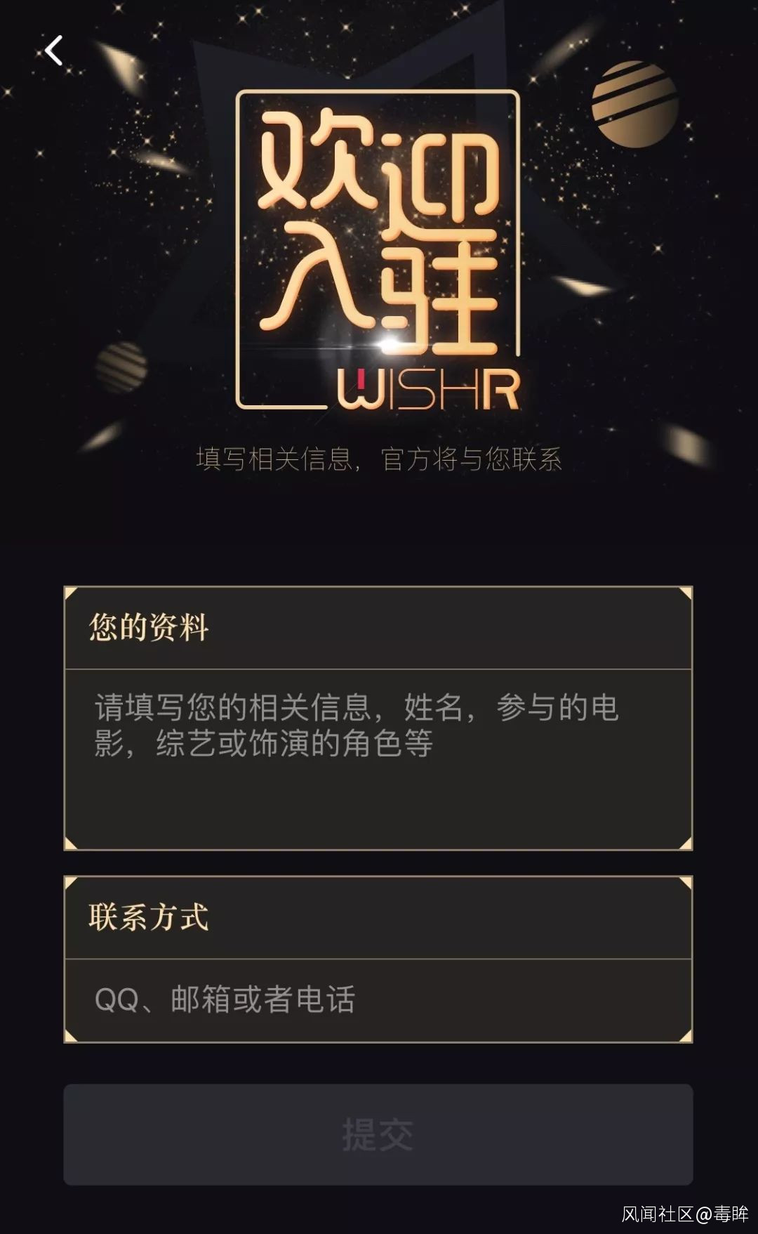 除了平台溝通,藝人也可以自行選擇入駐平台,並且入駐門檻極低。按照客服的介紹,明星團隊只需要在入駐窗口填寫個人信息即可,或者直接與客服聯繫申請入駐。而當毒眸問及價格標準和分成問題時,客服直接表示不方便透露具體數字,平台只會給予一個底價,基本上都是由明星自己去確定最終的價格。