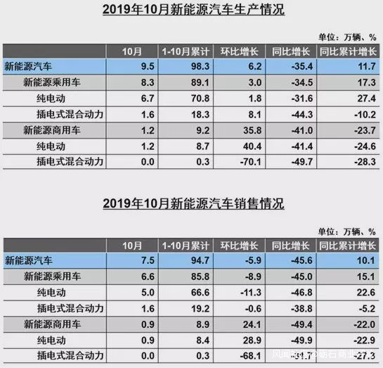 中汽協發佈的新能源車產銷數據顯示,2019年10月新能源車產銷量分別為9.5萬輛、7.5萬輛,同比下降35.4%和45.6%;10月新能源乘用車銷售6.6萬輛,其中,純電動乘用車銷售5萬輛,環比下滑11.3%,插電式混合動力車銷售1.6萬輛,同比下降38.7%。