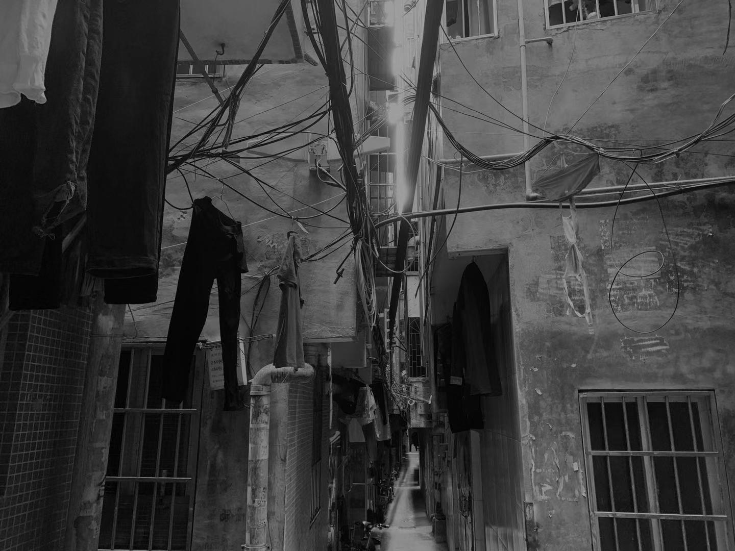 這裏是廣州東北部著名的城中村。絞在一起的電線在緊密的樓房間鑽進鑽出,內衣褲隨意晾掛在上面,陽光找不到一絲照進來的縫隙。環衞工、建築工人、外賣小哥、餐廳酒店服務員聚集在這兒。順着巷外的街道,路兩旁是炒飯、燒烤、腸粉各種小吃店,賣水果的流動商販,以及圍攏在空地上下象棋的無業遊民。