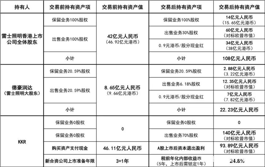 藉此股權交易,雷士照明香港上市公司的全體股東均可以獲得豐厚的現實股權價值回報和未來更巨大的股權價值空間;而德豪潤達可以立刻收到7億元真金白銀投資收益,以摘掉頭上的“ST”帽安全着陸,並可繼續享有雷士照明中國合資公司對應的股權價值回報;KKR更是做了一筆劃算的大買賣。