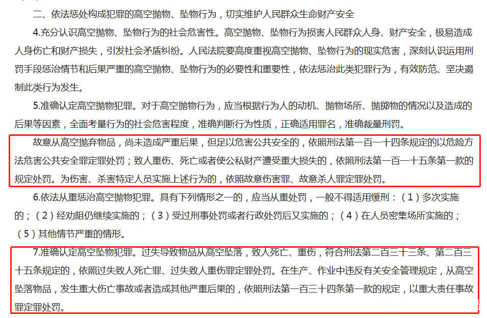 據瞭解,2019年11月14日,最高人民法院發佈《關於依法妥善審理高空拋物、墜物案件的意見》,為有效預防和依法懲治高空拋物、墜物行為,提出16條具體措施,公佈高空拋物、墜物造成嚴重後果的,可按照故意傷害罪、故意殺人罪定罪處罰。