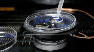 你可以讓揚聲器發出各種頻率的聲音,看看液滴是否會形成。