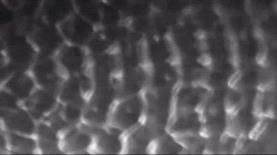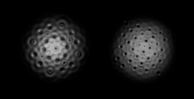 看,這是硅油在產生了垂直的正弦波的液麪上的情形。Couder 發現,可以用這個方法讓硅油液滴振動幾天都不會停下來和下面的液麪聚並。