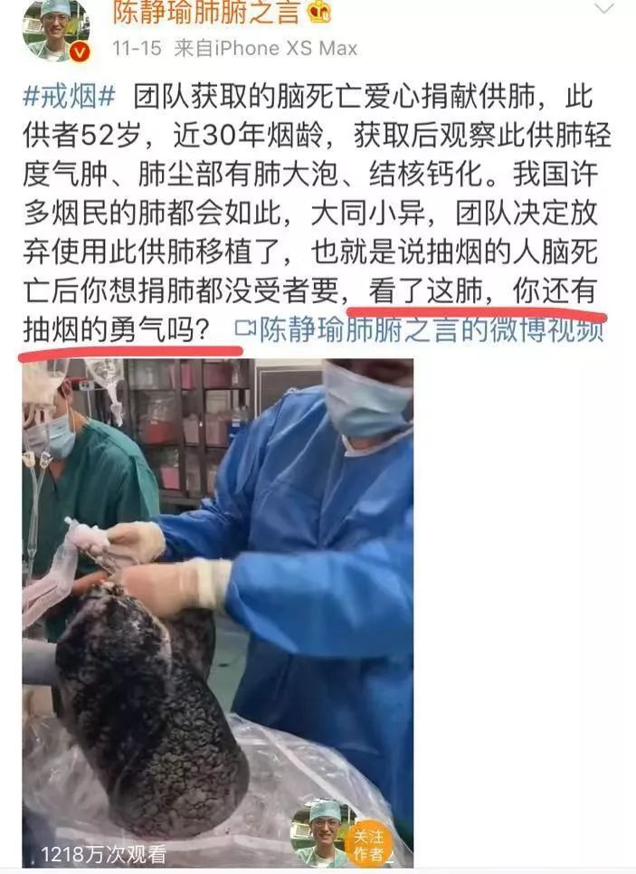 抽煙30年人的肺會變成什麼樣?著名肺移植專家陳靜瑜教授在微博發佈了一則視頻點擊迅速突破1218萬: