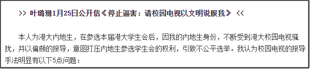 2015年,在香港大學就讀的內地生葉璐珊去競選學生會,被學生抵制、攻擊、騷擾。
