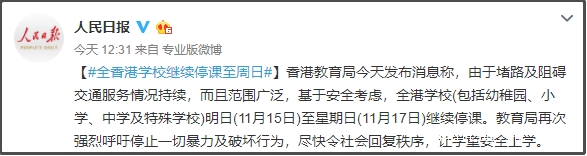 香港教育局發了一個通知,基於安全考慮,全港繼續停課至週日。