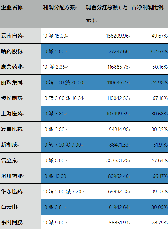 13家A股藥企分紅金額超過5億元,其中,哈藥股份佔淨利潤比例最高,達312.67%。