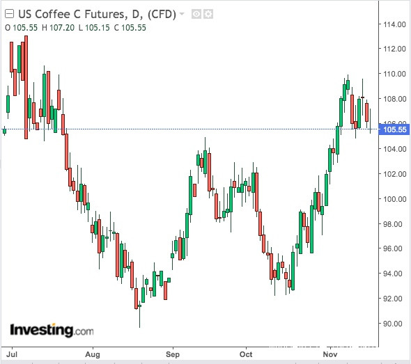 本週一,阿拉比卡收於每磅1.092美元,3月交割的基準阿拉比卡咖啡僅略低於11月8日觸及的7月高點1.099美元。