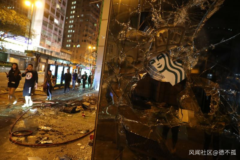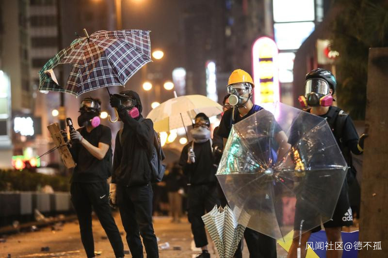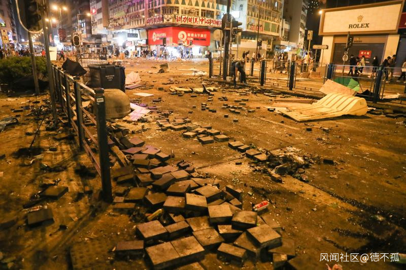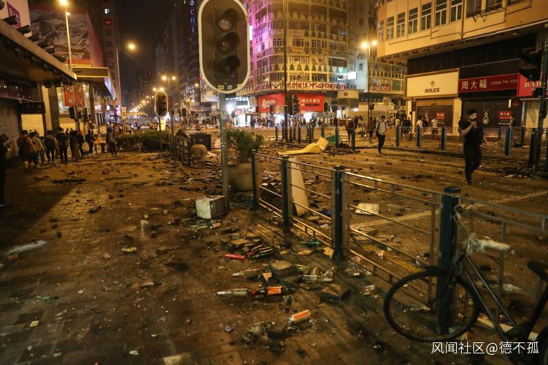 深夜,暴徒逐漸散去,馬路上只留下一把把破損的傘,被風吹得胡亂飛揚。普通市民捂着口鼻,繞着磚塊和鐵枝在行人道上艱難前行。