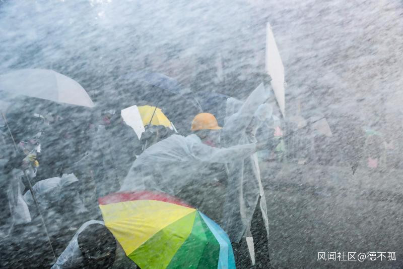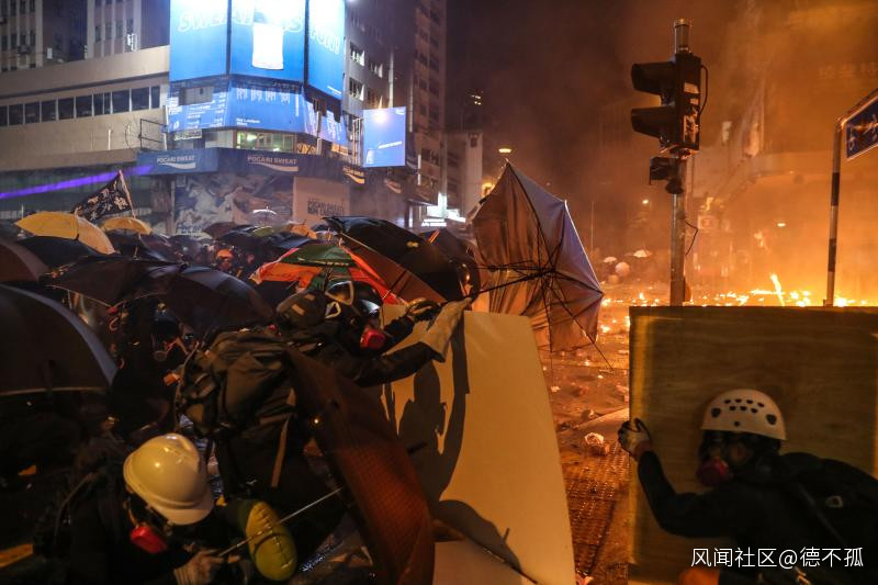 當一座城市陷入失控,人流在慌亂中四處逃竄,每走一步,腳邊就有一個汽油彈爆炸後留下的火種。在尖沙咀警署門外,黑衣人用路障和傘陣設起防線,向警署投擲汽油彈,警方在高處防禦,橡膠子彈打在傘上發出霹靂巴拉的聲響。當一批防暴警察從路口跑進來,他們就立刻如流水一般朝另一個路口沒命地狂奔。