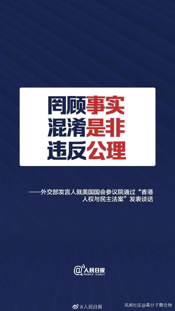 **美國國會參議院通過的這個法案,目的根本不是為了什麼“人權”與“民主”,而是在給香港的違法犯罪分子擦脂抹粉、搖旗吶喊,其險惡用心昭然若揭。**美國的這些反華勢力企圖以此破壞香港的繁榮穩定,遏制中國的發展。我們要正告這些人,你們的企圖是徒勞的,是永遠不會得逞的。任何人、任何勢力都不要低估中國中央政府和全體中國人民捍衞國家主權、安全、統一,維護香港繁榮穩定的堅強意志和堅定決心。香港是中國的一個特別行政區,不是美國的哪一個州。美國應立即停止干涉中國內政,停止干涉香港事務,否則只會搬起石頭砸自己的腳。如果美方執迷不悟、頑固堅持其錯誤立場,我們堅決支持中央政府採取有力措施,予以堅決反制。