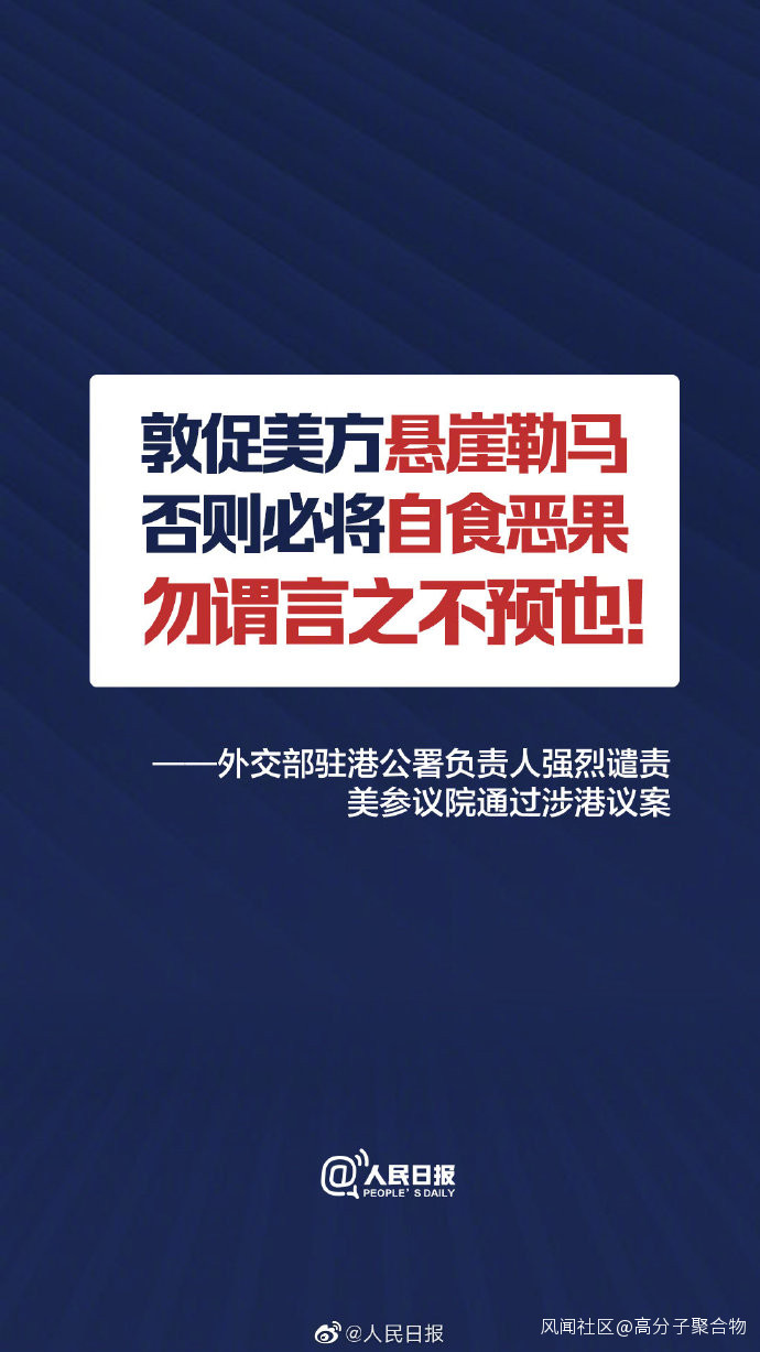 **外交部駐港公署負責人強烈譴責美參議院通過涉港議案:**敦促美方懸崖勒馬,否則必將自食惡果