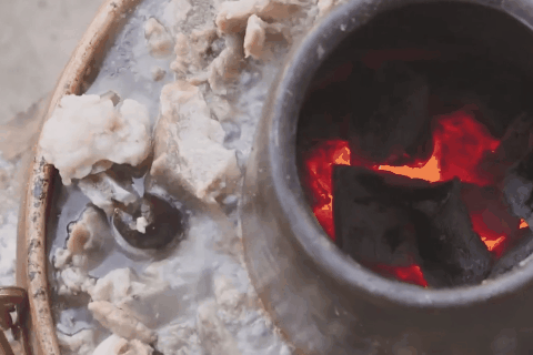 粥水火鍋是順德名菜,陳年的香米放進厚身的大瓦煲裏慢煮,粥底米香撲鼻,粥水講究水米融合、粘稠適中、柔膩如一,濃濃的粥底把肉浸熟,最大限度的保留了肉的鮮甜。