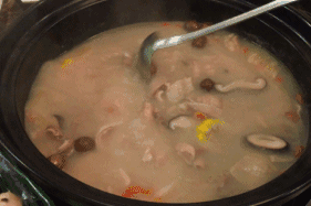 先慢慢放入海鮮,掌握好火候,一定要在煮到剛剛好熟就撈起,把食材原始的味道保存下來,這是順德菜的精髓所在。緊接着放入撈味菜、油炸鬼,再次等他煮開之後,粥底又變成一道佳味。