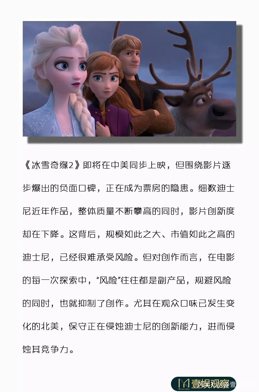 榮光的背後還存在“隱患”,除了《冰雪奇緣2》的北美口碑低迷,被指責為毫無創新的作品之外,其在中國市場的表現相較以往也缺少更多亮點。