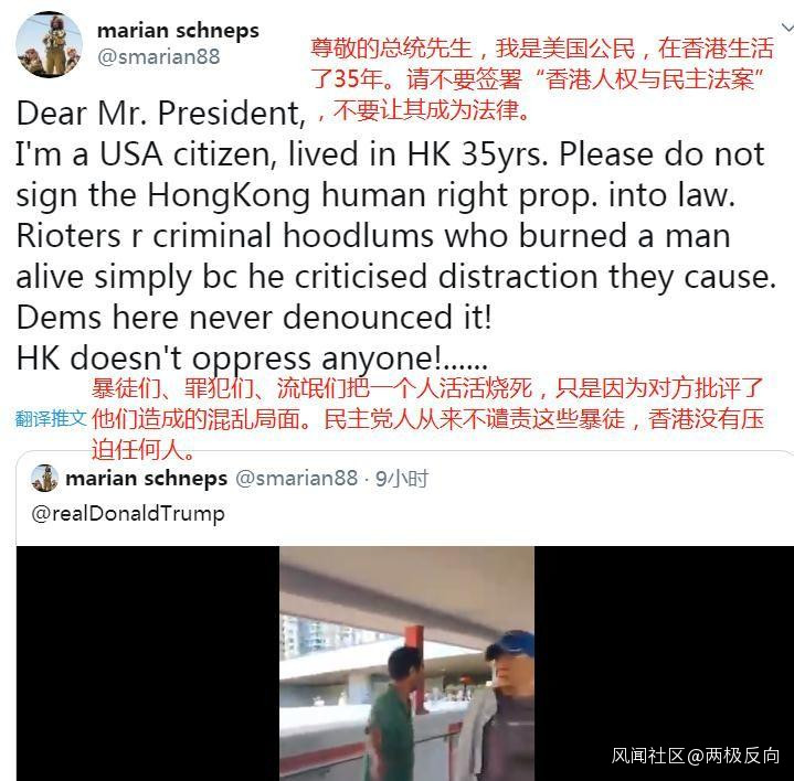 尊敬的總統先生,我是美國公民,在香港生活了35年。請不要簽署“香港人權與民主法案”,不要讓其成為法律。暴徒們、罪犯們、流氓們把一個人活活燒着,只是因為對方批評了他們造成的混亂局面。這裏的“民主派”們從來不譴責這些暴徒,香港沒有壓迫任何人。