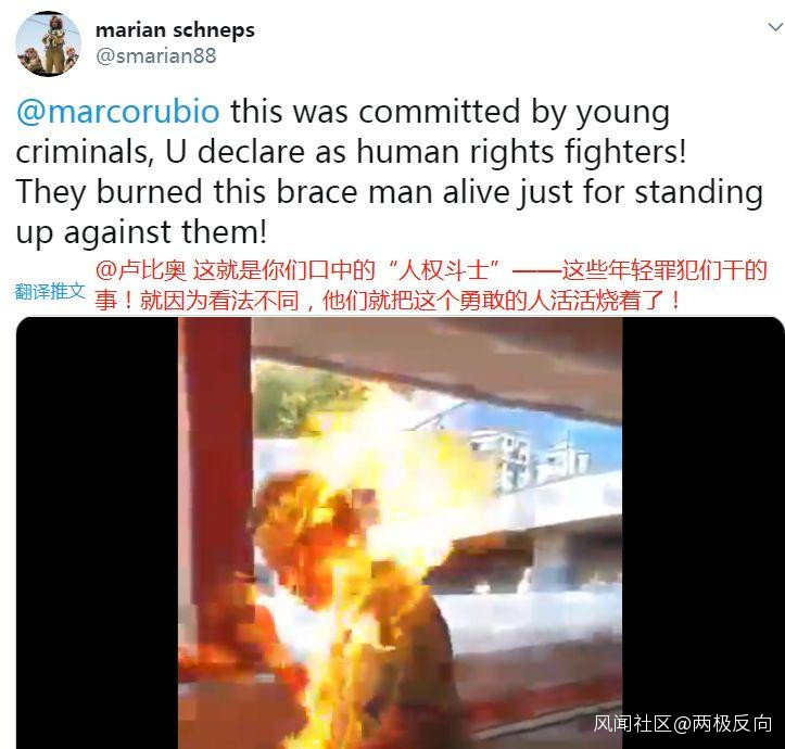 報道提及,瑪麗安在推特上發佈多篇帖文。在一篇帖文中,他@美國反華議員盧比奧,並憤怒聲討:這就是你們口中的“人權鬥士”——這些年輕罪犯們乾的事!就因為他站出來反對,他們就把這個勇敢的人活活燒着了!↓