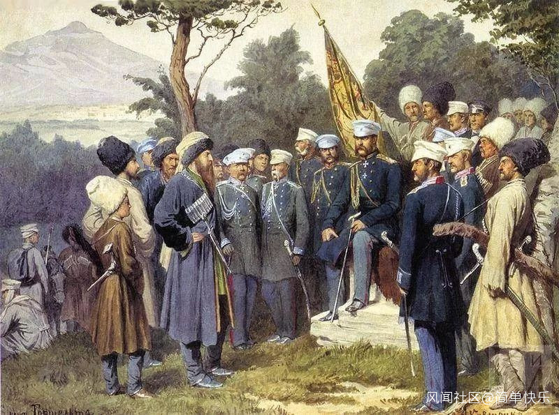 Aleksey Kivshenko的另一幅畫作,表現了1859年高加索穆斯林叛軍首領沙米爾向俄軍投降的情景