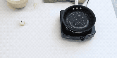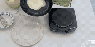 然後,順勢讓麪糊往平底鍋的另一邊滑過去,同時儘量讓麪糊畫出一個圓形。