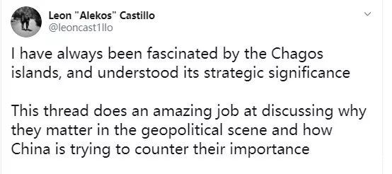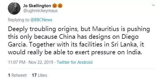 在境外社交平台推特上,有人就宣稱毛里求斯會為查戈斯羣島的事情而對英國發難,是因為中國在背後推動,甚至有人還扯淡説中國是想把英國和美國趕走後自己霸佔查戈斯羣島和其中的迭戈加西亞島,好對印度施壓……