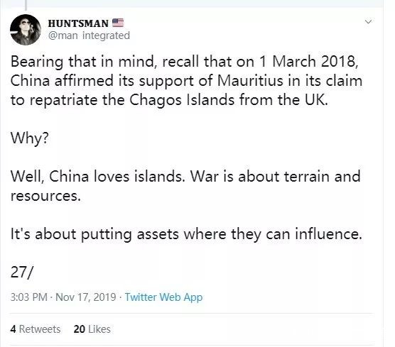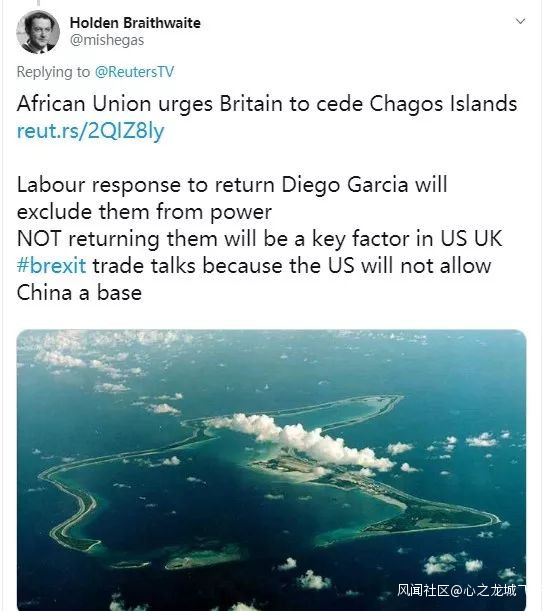 還有人宣稱美國也不會允許英國將查戈斯羣島還給毛里求斯,因為那樣就會讓那裏變成一箇中國的基地: