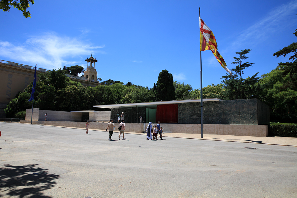 巴塞羅那的陽光非常強烈,與米斯的White Light Bright的簡約主義相得益彰,形成強烈的光和影的效果,非常適合觀賞。但要是拍照,這就很痛苦了。那個Art Deco的女銅像非常難拍,背景的灰綠色又對曝光特別不友好,不大量補償的話,肯定wash out。平台上平直的線條問題不大,也需要壓一點曝光,但陰影裏就一片漆黑了,用後期可以調出來,但是偷懶了,沒去弄。最大的考驗的:光禿禿的廣場上,那叫一個熱,一不小心就要中暑了。真心要拍照的話,可能陰天拍黑白反而更好,反正也沒有多少顏色。或者早晚陽光不那麼強烈的時候去,不過那時不知道是不是開門了。原建築是徹底通透的,沒有門,現在加上玻璃門了,還好,沒有破壞原來的簡約太多,但晚上可以鎖起來了。除了幾張巴塞羅那椅,裏面空空蕩蕩,沒什麼好偷的,不過還是應該晚上鎖起來,否則就會亂七八糟了。