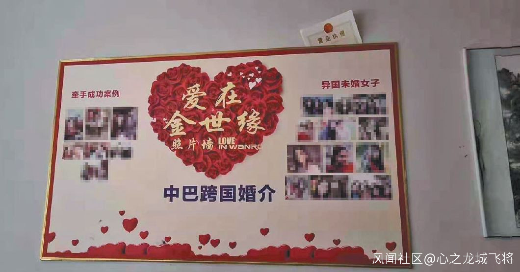 ▲在金世緣婚介所內,牆上掛着跨國婚介的相關照片。受訪者供圖