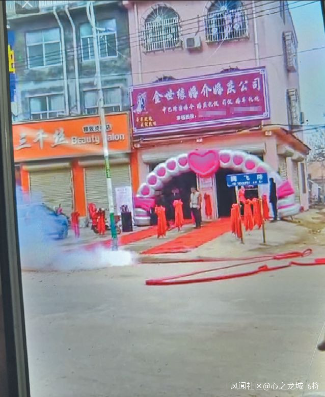 11月6日、8日,新京報記者曾兩次到位於民權縣王橋鎮的金世緣婚介所,該店的招牌已經不見,捲簾門緊閉,一旁釘着的一塊鐵牌上,寫着“金世緣婚慶”。