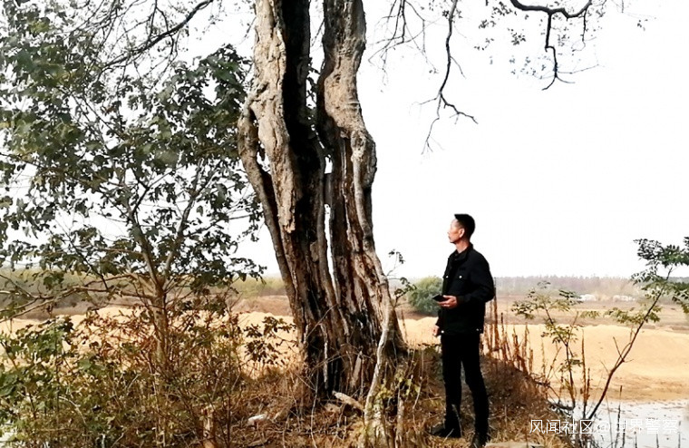 11月24日上午,筆者在某村黃金洲灣以西的河邊看到,一棵貌似很挺拔的古樸樹,儘管其樹幹已經沒有了,變成了只剩下2塊樹皮支撐着的空心樹,然而它卻依然屹立不倒並且頑強地活着,當地的林業部門還將其掛牌保護了起來。
