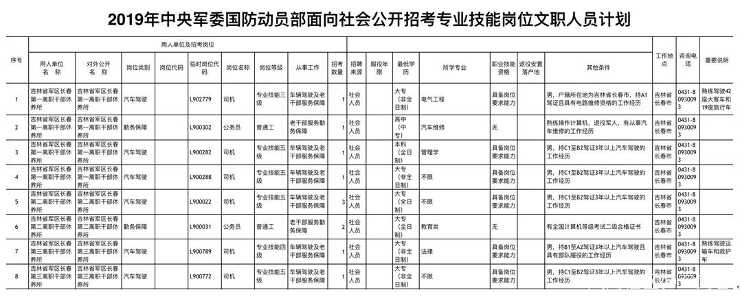 在細數提供的崗位中:軍委國防動員部此次提供的是所屬老幹部服務保障機構的司機、公務員、收發員兼通信員等崗位,其中司機為技術工,公務員、收發員兼通信員為普通工。