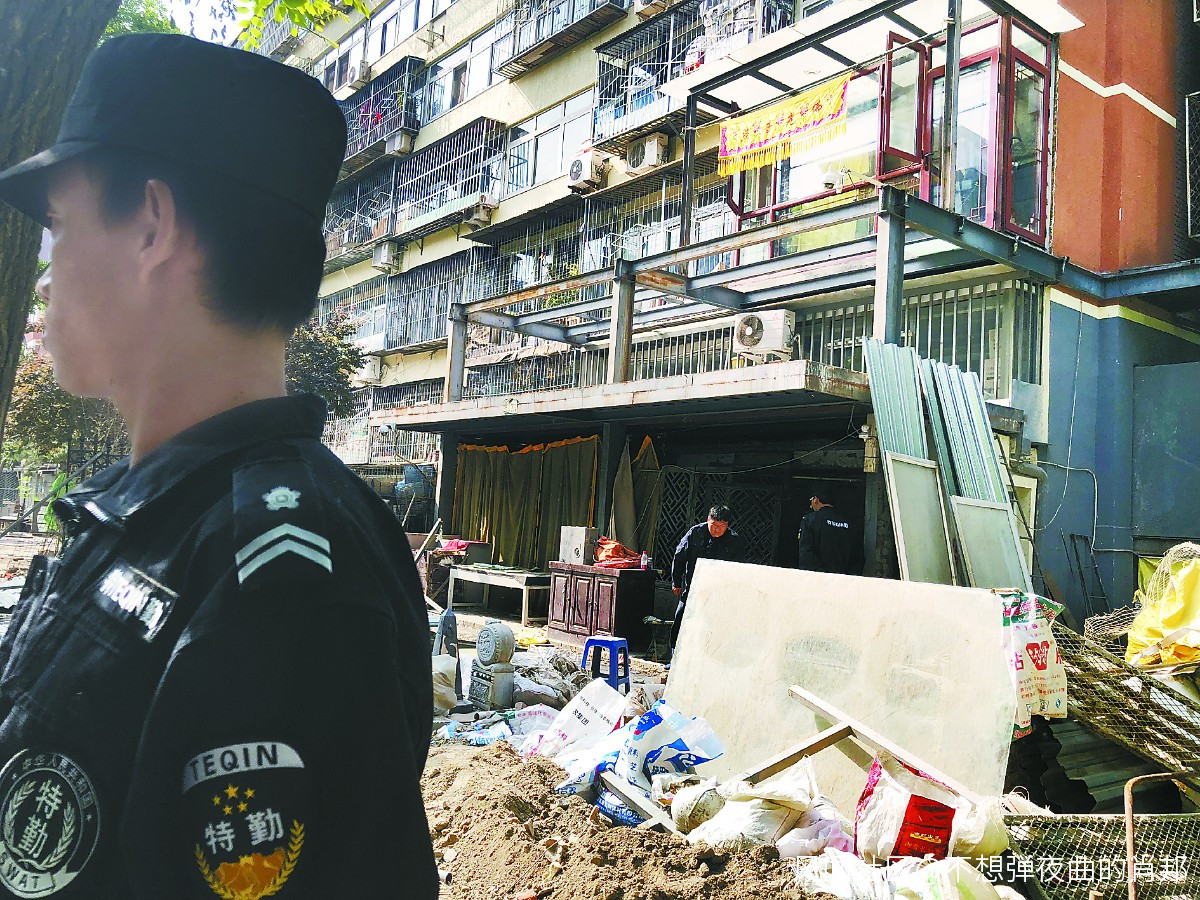 當大型機械向4號樓最東側靠近時,在旁邊圍觀的業主鄧某突然情緒失控,大喊大叫,“下面是空的,危險”“不要靠近”……並衝上去阻攔推土機繼續前進。兩名街道保安見此情況,趕忙抱住鄧某,以免受傷。