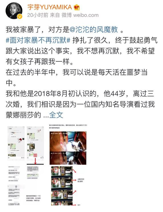 宇芽因傳神的化妝技巧而走紅,其中尤以蒙娜麗莎仿妝最為著名。昨天,宇芽在微博上用圖文並茂的長篇內容,詳盡揭露並控訴了施暴者“沱沱的風魔教”對她實施的精神虐待和肉體暴力。其間,傷害與賠罪交替上演的戲碼,完全符合家暴的標準劇本。