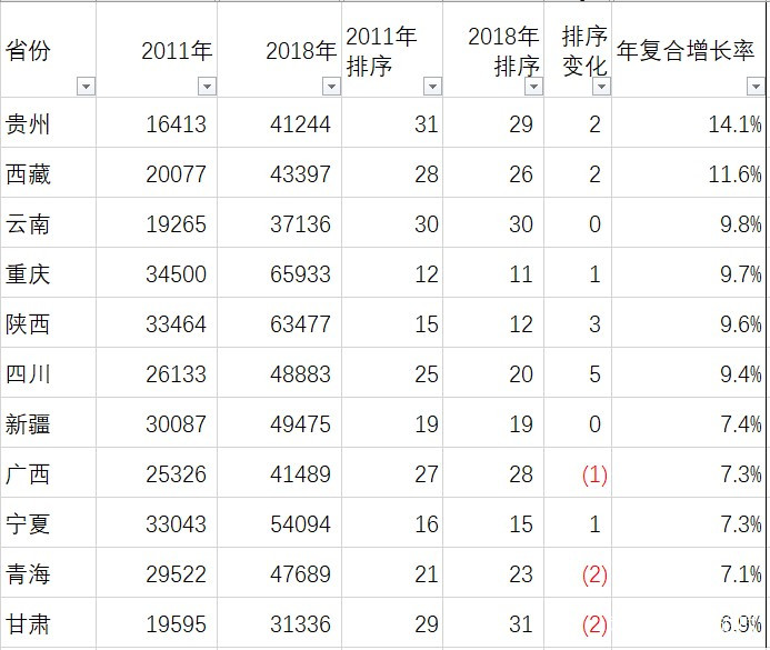 表:2011年-2018年各地人均GDP變化情況,按照增長率排名