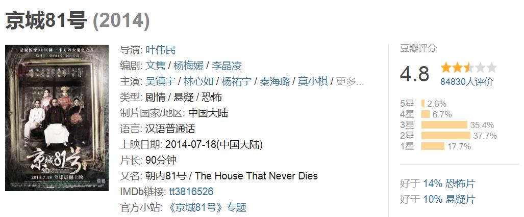 曾幾何時,國產恐怖片也是可以“通過假鬼賺真錢”的。福建恆業影業製作發行的《京城81號》,在2014年就豪取4.11億票房;2017年,我們製作有限公司製作出品的《妖鈴鈴》雖是“半喜不恐”,卻也有3.63億票房;更不用説2011年美亞娛樂的《孤島驚魂》以500萬成本撬動8900萬票房,讓楊冪成為最早的流量電影代表。